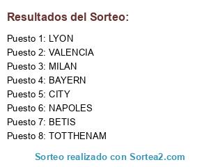 Lista de participantes: LYON, VALENCIA, BAYERN, NAPOLES, MILAN, BETIS, TOTTHENAM, CITY.