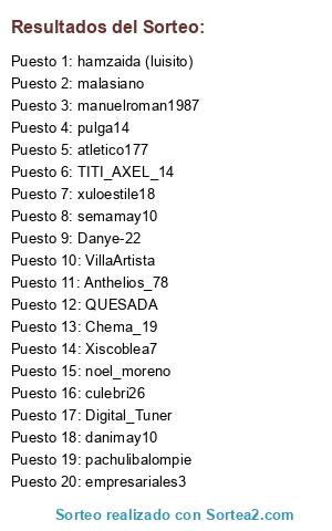 Lista de participantes: empresariales3, semamay10, malasiano, danimay10, atletico177, culebri26, Digital_Tuner, noel_moreno, pachulibalompie, manuelroman1987, hamzaida (luisito), Chema_19, Xiscoblea7, TITI_AXEL_14, xuloestile18, pulga14, VillaArtista, Danye-22, Anthelios_78, QUESADA.