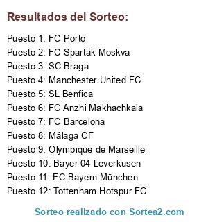 Lista de participantes: Paris Saint-Germain FC, FC Porto, FC Zürich, FC Schalke 04, Arsenal FC, Olympiacos FC, Montpellier Hérault SC, Málaga CF, AC Milán, FC Zenit St. Petersburg, RSC Anderlecht, Borussia Dortmund, Real Madrid CF, AFC Ajax, Manchester City FC, Chelsea FC, Juventus, CSKA Moskva, FC Bayern München, Valencia CF, LOSC Lille, FC Barcelona, Celtic FC, SL Benfica, FC Spartak Moskva, Manchester United FC, Galatasaray AS, SC Braga, Liverpool FC, Udinese Calcio, FC Anzhi Makhachkala, Club Atlético de Madrid, Olympique de Marseille, Borussia M'gladbach, Tottenham Hotspur FC, Panathinaikos FC, S.S. Lazio, Sporting Clube de Portugal, FC Girondins de Bordeaux, Newcastle United, FC Internazionale Milano, VfB Stuttgart, FC København, PSV Eindhoven, SSC Napoli, Bayer 04 Leverkusen, Olympique Lyonnais, Athletic Club, FC Rubin Kazan, FC Twente, Hannover 96, UD Levante.