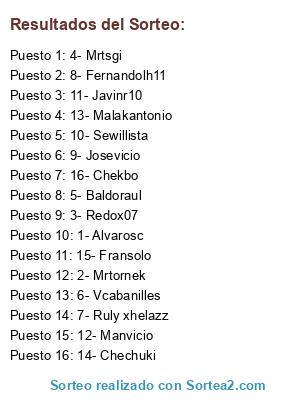 Lista de participantes: 1- Alvarosc, 2- Mrtornek, 3- Redox07, 4- Mrtsgi, 5- Baldoraul, 6- Vcabanilles, 7- Ruly xhelazz, 8- Fernandolh11, 9- Josevicio, 10- Sewillista, 11- Javinr10, 12- Manvicio, 13- Malakantonio, 14- Chechuki, 15- Fransolo, 16- Chekbo.