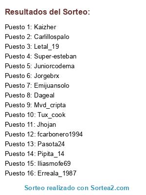 Lista de participantes: Super-esteban, Jhojan, fcarbonero1994, Emijuansolo, Jorgebrx, Mvd_cripta, Erreala_1987, Kaizher, Letal_19, Tux_cook, Pipita_14, Iliasmofe69, Carlillospalo, Dageal, Juniorcodema, Pasota24.