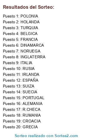 Lista de participantes: ESPAÑA, PORTUGAL, ALEMANIA, HOLANDA, INGLATERRA, FRANCIA, ITALIA, BELGICA, CROACIA, DINAMARCA, R.CHECA, RUMANIA, NORUEGA, POLONIA, SUIZA, GRECIA, SUECIA, IRLANDA, RUSIA, TURQUIA.