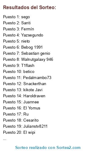 Lista de participantes: sullendonkey821, Cesarito, Fermín, nieto, betico, Santi, Juannee, El Yomus, maxi, T1flash, Sebastian genio, Yazsegundo, kikote Javi, Haroldraven, sego, Ru, Daniel250982, Walnutgalaxy 946, Pedalmambo73, ByDavid180, Snackerthan, Bebog 1991, Julianstv8211, El wipi.