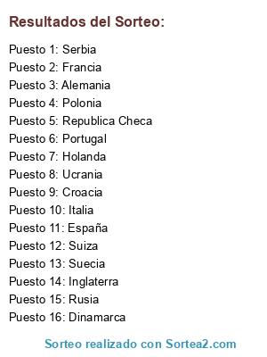 Lista de participantes: Polonia, Dinamarca, Suiza, Ucrania, Suecia, Republica Checa, Croacia, Serbia, Rusia, Holanda, España, Alemania, Italia, Inglaterra, Portugal, Francia.