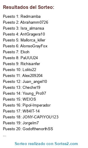 Lista de participantes: Ekoh, Adrianmaese, KaseO_crew, Barlica_churros, Mallorca_killer, Pipol-Imperador, Marlito12, Redmamba, SORAK_PRO, Clapped_by_mv, Young_Pro97, Richisanfer, Labestianegra10, Imbaedo1, Cases_89, Lolito22, Abrahamm0726, AlonsoGrayFox, PEP_TEAM1989, AntGragera10, WEIOS, JONY-CAPIYOU123, Isra_almansa, Cheche19, GodofthenorthSS, SharkGar06, Alex209204, Jorgelm7, W84IT-14, Juan_angel10, PaUUU24, Soto___11.