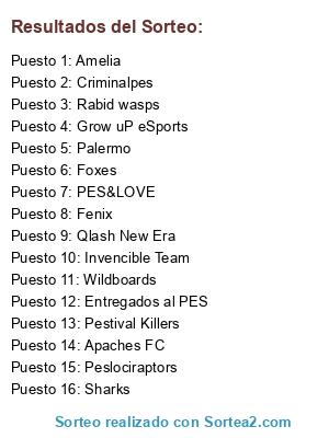 Lista de participantes: Amelia, Qlash New Era, Sharks, PES&LOVE, Pestival Killers, Entregados al PES, Apaches FC, Wildboards, Peslociraptors, Grow uP eSports, Foxes, Palermo, Criminalpes, Invencible Team, Rabid wasps, Fenix.