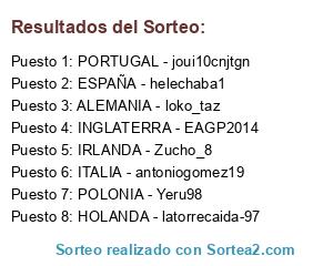 Lista de participantes: ALEMANIA - loko_taz, BÉLGICA - Kevin-vm-8, ESPAÑA - helechaba1, FRANCIA - Manuel_Cdlm, GALES - Soyunvale1, HOLANDA - latorrecaida-97, INGLATERRA - EAGP2014, IRLANDA - Zucho_8, ITALIA - antoniogomez19, POLONIA - Yeru98, PORTUGAL - joui10cnjtgn, RUSIA - EA_ErAsesinoUK, SUECIA - Leogartner4, SUIZA - Karaka000, TURQUÍA - francocarmd.