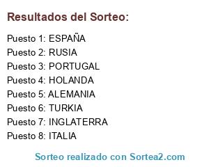 Lista de participantes: ALEMANIA, INGLATERRA, FRANCIA, HOLANDA, ITALIA, RUSIA, ESPAÑA, TURKIA, R.CHECA, PORTUGAL, SUECIA, R.IRLANDA.