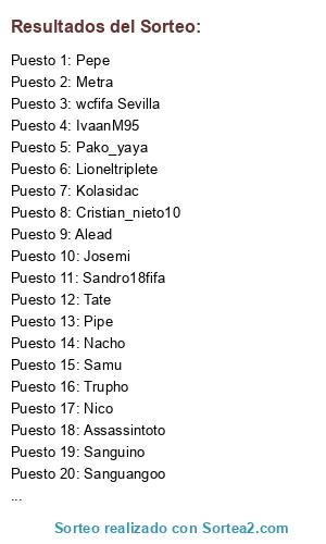 Lista de participantes: Assassintoto, Pako_yaya, IvaanM95, Lioneltriplete, Sandro18fifa, Kolasidac, Nacho, Pipe, Tate, Aitor, Alead, Jairo, John, Josemi, Metra, Nico, Pepe, Samu, Sergilujo, Sanguino, Cristian_nieto10, Trupho, Sanguangoo, wcfifa Sevilla.