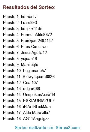 Lista de participantes: iR7x lBlackMan, Aldo Maravilla7, hernanfv, yujuan19, Ceal107, Mariiioqfc, edgar088, ESKIAURIAZUL7, Legionario57, Frankjam2494147, benji0711dm, UnspokenAxis714, AG11Angelgzz, Blowysquare8826, FormulaMite8872, El es Coentrao, JesusAguila12, Luiss993.