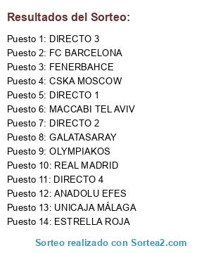Lista de participantes: ANADOLU EFES, CSKA MOSCOW, GALATASARAY, FENERBAHCE, FC BARCELONA, REAL MADRID, UNICAJA MÁLAGA, MACCABI TEL AVIV, ESTRELLA ROJA, OLYMPIAKOS, DIRECTO 1, DIRECTO 2, DIRECTO 3, DIRECTO 4.