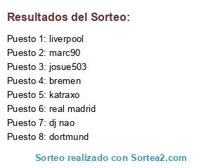 Lista de participantes: real madrid, bremen, dortmund, liverpool, marc90, katraxo, dj nao, josue503.