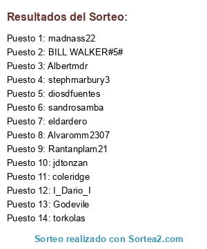 Lista de participantes: Alvaromm2307, I_Dario_I, Rantanplam21, stephmarbury3, BILL WALKER#5#, Godevile, Albertmdr, eldardero, jdtonzan, diosdfuentes, sandrosamba, coleridge, torkolas, madnass22.
