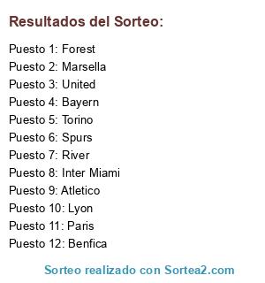Lista de participantes: Benfica, Atletico, Marsella, Bayern, Lyon, Paris, Torino, United, Inter Miami, Forest, River, Spurs.