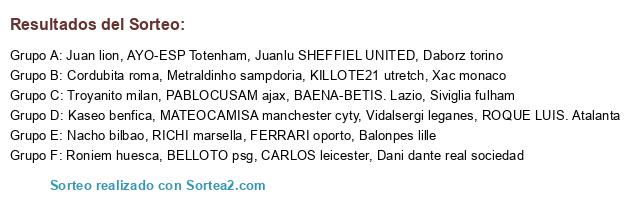 Lista de participantes: PABLOCUSAM ajax, ROQUE LUIS. Atalanta, BELLOTO psg, KILLOTE21 utretch, RICHI marsella, FERRARI oporto, MATEOCAMISAÂ manchester cyty, BAENA-BETIS. Lazio, CARLOS leicester, AYO-ESP Totenham, Cordubita roma, Juan lion, Troyanito milan, Juanlu SHEFFIEL UNITED, Nacho bilbao, Kaseo benfica, Xac monaco, Metraldinho sampdoria, Dani dante real sociedad, Roniem huesca, Vidalsergi leganes, Balonpes lille, Daborz torino, Siviglia fulham.