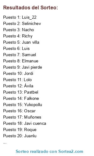 Lista de participantes: Nacho, Muñones, Javi cuenca, Chipi, Víctor, Samuel, Falkone, Pastbel, Diego, Lolo, Luis, Selinichev, Ferrari, Luis_22, Jordi, Yukopollu, Juan villa, Richy, Juanlu, Elmanue, Javi pierde, Ávila, Roque, Oscar.