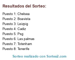 Lista de participantes: Boavista, Cadiz, Tenerife, Las palmas, Psg, Totenham, Chelsea, Leizpig.