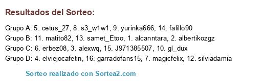 Lista de participantes: 1. alcanntara, 2. albertikozgz, 3. alexwq, 4. elviejocafetin, 5. cetus_27, 6. erbez08, 7. magicfelix, 8. s3_w1w1, 9. yurinka666, 10. gl_dux, 11. matito82, 12. silviadamia, 13. samet_Etoo, 14. falillo90, 15. J971385507, 16. garradofans15.