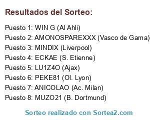 Lista de participantes: PEKE81 (Ol. Lyon), MUZO21 (B. Dortmund), AMONOSPAREXXX (Vasco de Gama), WIN G (Al Ahli), ANICOLAO (Ac. Milan), LU1Z4O (Ajax), MINDIX (Liverpool), ECKAE (S. Etienne).