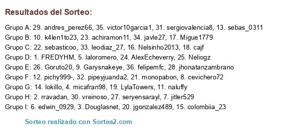 Lista de participantes: 1. FREDYHM, 2. rravadan, 3. Douglasnet, 4. micafran98, 5. laloromero, 6. edwin_0929, 7. jitler529, 8. cevichero72, 9. Garysnakeye, 10. k4len1to23, 11. naluffy, 12. pichy999-, 13. sebas_0311, 14. lokillo, 15. colombiia_23, 16. Nelsinho2013, 17. Migue1779, 18. cajf, 19. LylaTowers, 20. jgonzalez489, 21. monopabon, 22. sebasticoo, 23. achiramon11, 24. AlexEcheverry, 25. Neliogz, 26. Goruto20, 27. seryensarayl, 28. jhonatanzambrano, 29. andres_perez66, 30. vreinoso, 31. sergiovalencia8, 32. pipeyjuanda2, 33. leodiaz_27, 34. javle27, 35. victor10garcia1, 36. felipemfc.