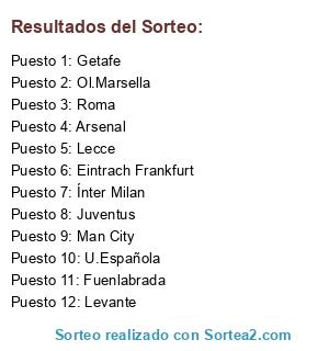 Lista de participantes: Ol.Marsella, Levante, Fuenlabrada, Ínter Milan, Eintrach Frankfurt, Roma, Man City, Getafe, Lecce, Juventus, U.Española, Arsenal.