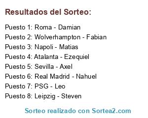 Lista de participantes: Napoli - Matias, Sevilla - Axel, PSG - Leo, Real Madrid - Nahuel, Roma - Damian, Wolverhampton - Fabian, Leipzig - Steven, Atalanta - Ezequiel.
