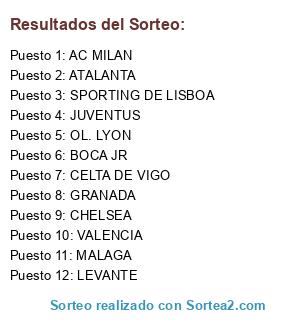 Lista de participantes: BOCA JR, ATALANTA, OL. LYON, GRANADA, CHELSEA, CELTA DE VIGO, MALAGA, AC MILAN, JUVENTUS, VALENCIA, SPORTING DE LISBOA, LEVANTE.