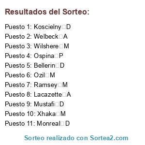Lista de participantes: Bellerin D, Koscielny D, Lacazette A, Monreal D, Mustafi D, Ospina P, Ozil M, Ramsey M, Welbeck A, Wilshere M, Xhaka M.