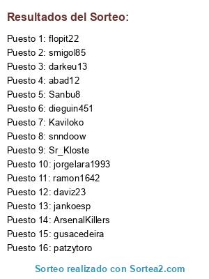 Lista de participantes: smigol85, Sanbu8, flopit22, Kaviloko, snndoow, daviz23, gusacedeira, dieguin451, jankoesp, jorgelara1993, abad12, ArsenalKillers, darkeu13, patzytoro, ramon1642, Sr_Kloste.