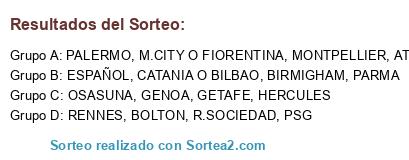 Lista de participantes: GETAFE, RENNES, HERCULES, R.SOCIEDAD, ESPAÑOL, PSG, PARMA, AT.MADRID, CATANIA O BILBAO, M.CITY O FIORENTINA, BIRMIGHAM, MONTPELLIER, OSASUNA, GENOA, PALERMO, BOLTON.