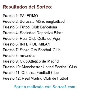 Lista de participantes: Manchester United Football Club, Real Madrid Club de Fútbol, Club Atlético de Madrid, PALERMO, Stoke City Football Club, Fútbol Club Barcelona, Borussia Mönchengladbach, Real Club Celta de Vigo, INTER DE MILAN, Chelsea Football Club, mirandes, Sociedad Deportiva Eibar.