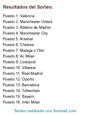 Lista de participantes: Ac Milan, Arsenal, Chelsea, Real Madrid, Barcelona, Liverpool, Manchester United, Villareal, Inter Milan, Manchester City, Atletico de Madrid, Oporto, Valencia, Bayern, Tottenham, Malaga o Otro.