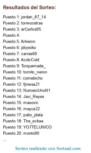 Lista de participantes: The_eckae, masovic, tomito_neron, palio_plata, comebicho, monto90, klose_14, jdrjosiko, erCarlos95, AcidcCold, albertikozgz, carras69, alberte74, YO77ELUNICO, Arkeron, NumeroUnoN1, jordan_87_14, Torquemada_, torrecostras, carro23, mayca22, Cerezeitor, Javi_Reyes, fjmesa21.