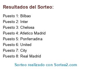 Lista de participantes: Real Madrid, Atletico Madrid, Chelsea, City, Ponferradina, United, Inter, Bilbao.