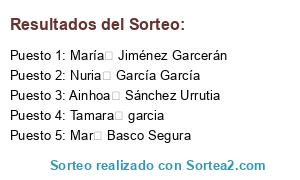 Lista de participantes: Ramon Chavalera, Sara Mayenco Doña, Rebeca Calvo Gaspar, Eva Vila, Reme Ballesteros Bolinches, Lilliam Infante Gil, Vane Gonzalez Avecilla, Miriam González Feria, Silvia Martin Expósito, Rocío Sánchez Olea, Maitane Alvarez Amor, Mª Inmaculada Guerrero Santiago, Noelia Carro, Lola Alba Martín, Jennifer Punzano pascual, Raquel Redondo París, Jessica Fernandez Pinto, SONIA GARRON PALOMAS, Ana Delgado Montero, Gema López Amaya, María Luisa Fonseca Carreño, Bea Artero, Vanessa Peralta rueda, Marián Conde Pinedo, Alejandra De rueda vinós, Angela valtierra Pérez, Flor Gutiérrez, Alicia Rey García, Liliana Franco Brandariz, Isabel Ceres Arranz, Sandra Fernández Pereira, Mariam Nuñez, Marta Oliver Sanchez, Elena María Gallardo Martín, Raquel Herrán Rebolledo, Belén Navarro Cruz, Ana Fernández Peñarroja, xiris vazquez., Angela Maria Garcia Lopez, Marta Lozano López, maria florencia salvador, Maite Sevilla del Pozo, Ainhoa Rodríguez Gutiérrez, Verónica Cano Latorre, Delia Heras Martin, Macarena Villarreal González, Isabel Perez Perez, Lorena Martín Romero, Sara Barquilla Vizcaino, Laura CAÑETE GUTIERREZ, Angeles Medina Ortega, Silvia conde garcía, Patricia Merino, Laura Acosta Ortega, Beatriz Martinez Sanchez, Noelia Cavada bedia, Patricia Juan Esteso, Raquel Castillo Vidal, Alejandra Martínez Sánchez, Lorena Hurtado González, Beatriz Iniesta Hernandez, LAURA CORRALES GALLEGO, Ainhoa Sánchez Urrutia, Aurora Barroso Menéndez, Amelia Martinez Madrazo, Paula David Pascual, Sandra González Martínez, Olivia Luis, Patricia Miras mira, jhossemar sivira diaz, Montse Mañá Álvarez, CARMEN RAMIREZ GOMEZ, Elisa Pascual de Vega, Ana Maria Diaz Ramos, Zulema Pontes Vidal, Ana Fernandez Suarez, Núria Arbonés, María Relea García, María Alia Sanz, Helena Jimenez Saez, Garazi Leanizbarrutia Alonso, Celia Sanchez Carrega, Marta Campabadal, Vanesa Castro Cortés, Esther Sanchez Guirao, Christine Borras Feurer, Beatriz Rincón Rodríguez, Raquel Fuentes Pomares, Inma García Palazón, Nuria Alcolea Moreno, Sofía Martínez Villa, ABIGAIL RIVERO LEZCANO, Sonia Gómez Diez, Silvia Martínez Rama, Raquel Acereda Padorno, Rosa María Núñez Aznar, Alicia Martínez Lérida, Begoña Botella Orts, Edurne Rus Zubia, María del Carmen Cao Fernández, gadea braceras rincon, Nieves García Anaya, MIRIAM SERRAT, Auxi Rodriguez Sanchez, ana marhuenda hernandez, Anna Moreno Font, Erika Corral Varela, Ana Asensio Serna, Noelia Cejudo Loreto, verónica Jiménez oliva, Moda Elle, Ainhoa LASARTE FDZ de LECETA, Sheila Moreno García, Stefania Giglifiore, Beatriz Garcia Nicolás, m carmen fernandez diaz, Tamara Plaza Romano, Aintzane Murga Llano, Raquel Merencio Diestro, Aurora Gomez Martin, G. M. B., Ruth Bartibás Vayas, RAQUEL ANTON, MARIA JOSE GIL GARCIA, Andrea Brujba Brujbu, Ana Herrera, Maria Jose Piornos Vazquez, sandra rubio franco, ELENA MARTIN ARENAS, Jimena Ciudad, María Pacheco Pacheco, ruth lopez garcia, ISA FERNANDEZ DELGADO, Laura Llopis, Ana Pereira Iglesias, SUSANA MARIA RAMIREZ CANALES, gema esteban morales, Celia Cuellas Roca, Raquel Jiménez Gutiérrez, Paula Galvez Merino, Laura Corbacho Sanchez, Noelia González Fernández, Julia Nieto Menéndez, Reyes Pizarro Tobías, Soledad Jiménez Martínez, Mª José Quiles ""Mallirubi en facebook", María del Pilar Carretero Muñoz, Luna García Alderete, Triana Ramos Sánchez, Patricia Flores del Fresno, Laura Aguilar Valero, M. JOSE CARCEL CERVERA, Laura Martinez Muñoz, Diana Gomez Garcia, Yolanda Martínez Berben, Mari Carmen Aguilar Aguilar, Marta Mato Hereu, Maria Cruz Adame, Ana Rodriguez Cuesta, Elisabet Cantó Ruiz, maria burgos herrera, Maku Belmonte Lamarca, Cristina Jiménez Sarmiento, Laura Contreras Pantoja, marta solozabal gallego, Maria Iglesias Maldonado, Aina Buforn, Patricia Gordillo L, Ángeles Regina Zavaleta Gordillo, Lourdes Gallardo Romero, FATIMA RAMOS GUISADO, María Álvarez Álvarez, Conchi Benavente Soria, Miriam Rengel Medina, Maria José Miró Aguiló, Inma Lupiañez Álvarez, Meritxell Paús Portales, Lourdes Marquez Alhambra, Inma lupiañez alvarez, Beatriz Moron, Milagros González Gallego, Cris Martínez Pineda, Montse Sanz Rubio, Águeda García de Durango, Maria Jesus Moreno Torreblanca, Jazmina Gomez Santana, Andrea Hurtado Vital, Cristina Navarro, BARBARA SERENA CARBONELL, María Lacarta Chavarrías, Eva López Marín, Raquel Rodríguez Maestro, Maribel Alfonso Pérez, rebeca Rodríguez Cuesta, Cristina Sánchez Irles, Maite Montes Callabed, Sara Huerta Coso, Maite Hernández Molinero, lola gutierrez, Ana Honrado, Ana vicente sanchez, Amparo Ochoa Brisa, LAURA HIDALGO LUMBRERAS, Carmen Esteban López, Mª Virginia Tevar Ruiz, Laura Canales Bartra, Maria Salud Garcia Lupiañez, Cristina Fernández Úbeda, Amparo Jiménez Carda, Ana Lidia Ferrero Vega, Mercedes Polo Martín, Irene Sánchez Irles, Tanit Planells Bastida, ines Bennasar Bestard, Rocio Murillo Navarrete, Beatriz Díez Gómez, Montserrat Franco Chamorro, Laura Sánchez Medina, Scherezade Ramos Bielsa, Elena Rodriguez Sebastian, María Carrión Martínez, Verónica Pereira Gutiérrez, Maria Gonzalez Gonzalez, Marjorie García Borràs, Irina blasco giuli, Jessica Vasco Monroig, Angeles Garcia Luque, Verónica Rodríguez Martínez, Debora Nheu Sanchez, ROSA MARIA CAMACHO, Gloria Py Albesa, Alba Yanguas, Maria Romero Carmona, mónica llorente fernández, verónica muñoz, Silvia Álvarez Aranguren, MARIA ELENA SANCHEZ RUIZ, Mar Basco Segura, antonia f morillas, Eva Maria olmo Escudero, Luz González, Paz Larrosa Pascual, Ixone Porral, Maria gonzález, Silvia Bartolomé Macías, Lisa Wantz, Omaira Álvarez González, Marian Guerrero, Raquel Castillo Garcia, Sara Lucea Murillo, Maria Campillo González, iratxe miguel nogueira, Susana Bosquet Segarra, Maritza Ghougassian, Andrea González Marrero, Gemma Martínez Palau, Marta de la Fuente Blanco, Nekane Gil Sánchez, laura fernández del puerto, lidia gil morante