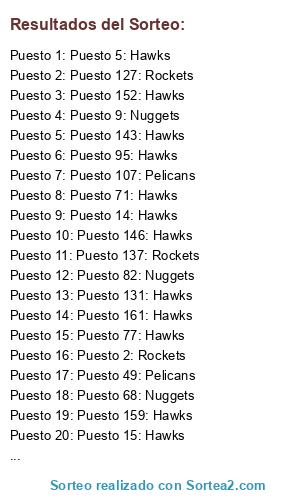 Lista de participantes: Puesto 1: Hawks, Puesto 2: Hawks, Puesto 3: Hawks, Puesto 4: Hawks, Puesto 5: Kings, Puesto 6: Hawks, Puesto 7: Hawks, Puesto 8: Hawks, Puesto 9: Hawks, Puesto 10: Hawks, Puesto 11: Magic, Puesto 12: Hawks, Puesto 13: Hawks, Puesto 14: Magic, Puesto 15: Hawks, Puesto 16: Magic, Puesto 17: Hawks, Puesto 18: Hawks, Puesto 19: Hawks, Puesto 20: Hawks, Puesto 21: Magic, Puesto 22: Hawks, Puesto 23: Magic, Puesto 24: Hawks, Puesto 25: Kings, Puesto 26: Kings, Puesto 27: Hawks, Puesto 28: Hawks, Puesto 29: Kings, Puesto 30: Hawks, Puesto 31: Magic, Puesto 32: Hawks, Puesto 33: Hawks, Puesto 34: Hawks, Puesto 35: Hawks, Puesto 36: Hawks, Puesto 37: Hawks, Puesto 38: Hawks, Puesto 39: Hawks, Puesto 40: Hawks, Puesto 41: Hawks, Puesto 42: Magic, Puesto 43: Hawks, Puesto 44: Hawks, Puesto 45: Kings, Puesto 46: Hawks, Puesto 47: Hawks, Puesto 48: Kings, Puesto 49: Magic, Puesto 50: Kings, Puesto 51: Hawks, Puesto 52: Magic, Puesto 53: Hawks, Puesto 54: Magic, Puesto 55: Hawks, Puesto 56: Magic, Puesto 57: Magic, Puesto 58: Hawks, Puesto 59: Hawks, Puesto 60: Hawks, Puesto 61: Hawks, Puesto 62: Kings, Puesto 63: Hawks, Puesto 64: Hawks, Puesto 65: Kings, Puesto 66: Magic, Puesto 67: Kings, Puesto 68: Hawks, Puesto 69: Hawks, Puesto 70: Kings, Puesto 71: Magic, Puesto 72: Hawks, Puesto 73: Hawks, Puesto 74: Hawks, Puesto 75: Kings, Puesto 76: Kings, Puesto 77: Hawks, Puesto 78: Hawks, Puesto 79: Hawks, Puesto 80: Hawks, Puesto 81: Hawks, Puesto 82: Magic, Puesto 83: Kings, Puesto 84: Magic, Puesto 85: Magic, Puesto 86: Magic, Puesto 87: Hawks, Puesto 88: Hawks, Puesto 89: Hawks, Puesto 90: Hawks, Puesto 91: Hawks, Puesto 92: Magic, Puesto 93: Hawks, Puesto 94: Hawks, Puesto 95: Hawks, Puesto 96: Hawks, Puesto 97: Hawks, Puesto 98: Magic, Puesto 99: Hawks, Puesto 100: Hawks, Puesto 101: Kings, Puesto 102: Magic, Puesto 103: Hawks, Puesto 104: Hawks, Puesto 105: Kings, Puesto 106: Hawks, Puesto 107: Hawks, Puesto 108: Kings, Puesto 109: Kings, Puesto 110: Hawks, Puesto 111: Hawks, Puesto 112: Hawks, Puesto 113: Magic, Puesto 114: Hawks.