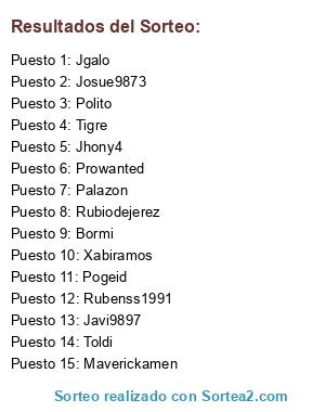 Lista de participantes: Jhony4, Javi9897, Palazon, Toldi, Prowanted, Josue9873, Xabiramos, Rubiodejerez, Jgalo, Polito, Maverickamen, Pogeid, Rubenss1991, Tigre, Bormi.