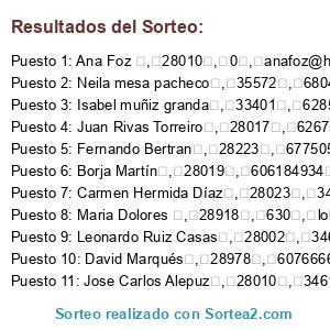 - Puesto 11: Jose Carlos Alepuz , 28010 , 34616942616 , jcalepuz@gmail.com