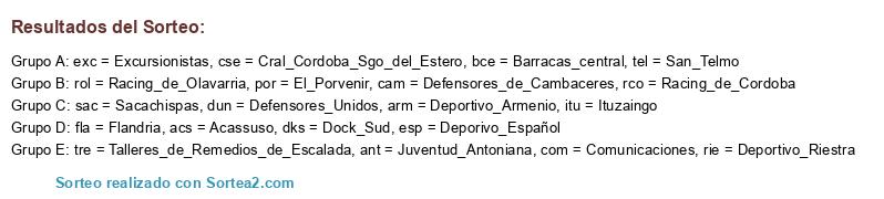 Lista de participantes: cse = Cral_Cordoba_Sgo_del_Estero, rol = Racing_de_Olavarria, esp = Deporivo_Español, por = El_Porvenir, tel = San_Telmo, rco = Racing_de_Cordoba, arm = Deportivo_Armenio, fla = Flandria, rie = Deportivo_Riestra, sac = Sacachispas, exc = Excursionistas, com = Comunicaciones, acs = Acassuso, dks = Dock_Sud, ant = Juventud_Antoniana, tre = Talleres_de_Remedios_de_Escalada, dun = Defensores_Unidos, bce = Barracas_central, itu = Ituzaingo, cam = Defensores_de_Cambaceres.