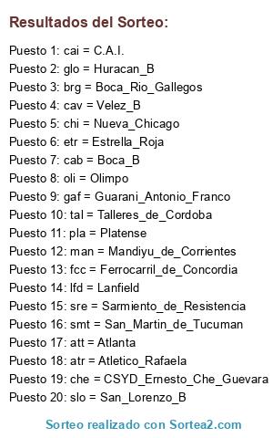 Lista de participantes: glo = Huracan_B, cab = Boca_B, cav = Velez_B, lfd = Lanfield, slo = San_Lorenzo_B, atr = Atletico_Rafaela, oli = Olimpo, smt = San_Martin_de_Tucuman, chi = Nueva_Chicago, che = CSYD_Ernesto_Che_Guevara, cai = C.A.I., tal = Talleres_de_Cordoba, gaf = Guarani_Antonio_Franco, sre = Sarmiento_de_Resistencia, etr = Estrella_Roja, brg = Boca_Rio_Gallegos, att = Atlanta, pla = Platense, fcc = Ferrocarril_de_Concordia, man = Mandiyu_de_Corrientes.
