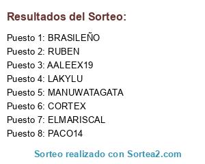 Lista de participantes: AALEEX19, BRASILEÑO, LAKYLU, CORTEX, ELMARISCAL, RUBEN, PACO14, MANUWATAGATA.