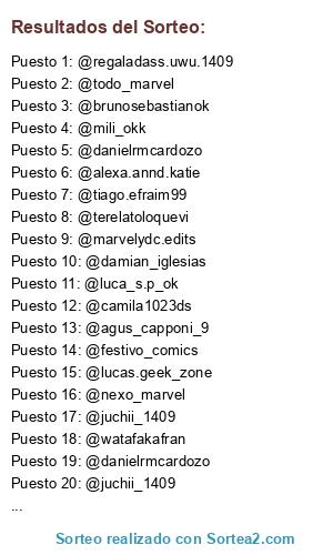 Lista de participantes: @la_bestia_online, @watafakafran, @damian_iglesias, @dark_cirus, @todo_marvel, @gabi_pal, @juraro81, @candesanchez0904, @candesanchez0904, @santi_nunez, @m.u.n.d.o_b.r.e.a.k, @fa_brixpro, @lucas.geek_zone, @la_bestia_online, @martinlobo97, @martinlobo97, @tiago.efraim99, @maxidodorico, @tiago.efraim99, @festivo_comics, @fhinojosa99, @agus_capponi_9, @agus_capponi_9, @agus_capponi_9, @agus_capponi_9, @adryy_varrenti, @tinsitoldm, @camila1023ds, @lady.ivy.quinn, @lady.ivy.quinn, @lady.ivy.quinn, @juanmedina6838, @franco__20, @terelatoloquevi, @nexo_marvel, @azazelgho, @danielrmcardozo, @danielrmcardozo, @danielrmcardozo, @lucas_fdm, @marito_desing_dg, @house_luchetti, @house_luchetti, @house_luchetti, @mili_okk, @juchii_1409, @juchii_1409, @luca_s.p_ok, @luca_s.p_ok, @competencias.de.todo, @competencias.de.todo, @competencias.de.todo, @regaladass.uwu.1409, @regaladass.uwu.1409, @alexa.annd.katie, @alexa.annd.katie, @alexa.annd.katie, @fer_lean, @fer_lean, @fer_lean, @fer_lean, @agustin.rosales.3785, @agustin.rosales.3785, @agustin.rosales.3785, @medias_love, @candesanchez0904, @marvelydc.edits, @marvelydc.edits, @la.sala.del.comic, @la.sala.del.comic, @brunosebastianok, @brunosebastianok, @brunosebastianok.