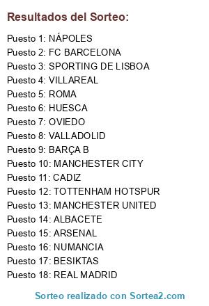 Lista de participantes: OPORTO, BAYERN DE MUNICH, LEICESTER, CHELSEA, NIZA, SPORTING DE GIJON, BESIKTAS, EVERTON, REAL MADRID, NASTIC, TOTTENHAM HOTSPUR, MONACO, VALENCIA, LYON, VALLADOLID, JUVENTUS, NUMANCIA, ARSENAL, CADIZ, FC BARCELONA, LEIPZIG, GRANADA, MANCHESTER CITY, INTER DE MILÁN, NÁPOLES, MILAN, ROMA, SEVILLA, LAZIO, OVIEDO, LIVERPOOL, RAYO VALLECANO, BORUSSIA DORTMUND, VILLAREAL, ALBACETE, ATHLETIC CLUB BILBAO, PSG, HUESCA, MANCHESTER UNITED, BARÇA B, ZENIT, SPORTING DE LISBOA, ALMERIA, ZARAGOZA, ATLÉTICO DE MADRID, OSASUNA.