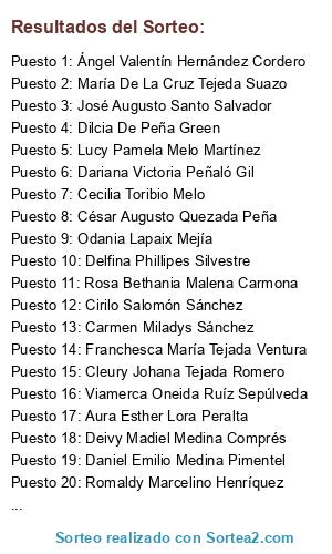 Lista de participantes: Ángel Valentín Hernández Cordero , Ariela De Los Ángeles Cruz Ramírez , Carmen Miladys Sánchez , Cecilia Toribio Melo , Cirilo Salomón Sánchez , Daniel Emilio Medina Pimentel , Dariana Victoria Peñaló Gil , Deivy Madiel Medina Comprés , Delfina Phillipes Silvestre , Dilcia De Peña Green , Iris Sugelly Borgen Santana , José Augusto Santo Salvador , Leonardo Antonio García Cruz , Leticia Carolina González Pérez , Lucy Pamela Melo Martínez , Odania Lapaix Mejía , Rosa Bethania Malena Carmona , Viamerca Oneida Ruíz Sepúlveda , Ysael Martínez Guerrero , Albania Esther Mejía Colón , Ana Delina Rosario Sánchez , Aura Esther Lora Peralta , Carmen Daniela Araujo Rivas , César Augusto Quezada Peña , Cleury Johana Tejada Romero , Doménico Eduardo Núñez Pimentel , Franchesca María Tejada Ventura , Gladys Lioceet De Los Santos González , Javiela Dolores Peña Paulino , Jhoan Manuel Vargas Rodríguez , Julio César Araujo Díaz , Lissa Melina Veras Rivas , María Consuelo Valenzuela Pérez , María De La Cruz Tejeda Suazo , Miguel Antonio Encarnación De La Rosa , Rogy Del Carmen Figueroa Taveras , Romaldy Marcelino Henríquez , Víctor Alfonso Ynoa Gómez , Yuleika Desire Henríquez Romero.
