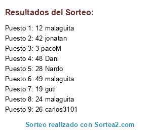 Lista de participantes: 1Nardo, 2 david esclapez, 3 pacoM, 4 pacoM, 5 guti, 6 carlos5225, 7 nico, 8 Juan1660, 9 david esclapez, 10 carlos5225, 11carlos5225, 12 malaguita, 13 carlos5225, 14 de celis, 15 Nardo, 16 osito, 17 Alexx, 18 lidia, 19 guti, 20 eduardo, 21eduardo, 22 eduardo, 23 eduardo, 24 malaguita, 25 bea, 26 carlos3101, 27 De celis, 28 Nardo, 29 osito, 30 Alexx, 31 osito, 32 jonatan, 33 PacoM, 34 lidia, 35 raul, 36 sergitaxi, 37 sergitaxi, 38 sergitaxi, 39 guti, 40 De celis, 41 david Esclapez, 42 jonatan, 43 bea, 44 Alexx, 45 nico, 46 Nardo, 47 Alexx, 48 Dani, 49 malaguita, 50 sergitaxi, 51jessi.