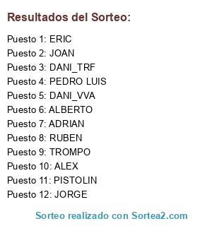 Lista de participantes: ALEX, JORGE, ALBERTO, RUBEN, PEDRO LUIS, ADRIAN, DANI_TRF, TROMPO, PISTOLIN, DANI_VVA, ERIC, JOAN.