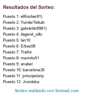 Lista de participantes: YunderTeikah, lan10, gabrielito8981), elRoober81), barcelona26, Jcordoba, ilegend_sillo, Traifor, Erbez08, principetony, anabel, marinito91.
