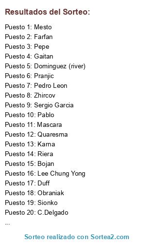 Lista de participantes: Pepe, Quaresma, Foggia, Menez, Karna, Mark Gonzalez, Farfan, Sergio Garcia, Piatti, Bojan, Gaitan, Zhircov, Di Michele, Capel, Duff, Riera, C.Rodriguez, Sionko, C.Delgado, Marko Marin, Dominguez (river), Mesto, Mascara, Pablo, Pedro Leon, Pranjic, Lee Chung Yong, Obraniak.