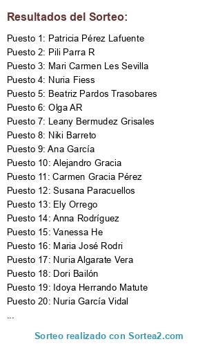 Lista de participantes: Dori Bailón, Nuria Fiess, Liliana liliana, Olga AR, Marisa Hernando, Benita Rodríguez, Vanessa He, Anna Rodríguez, Beatriz Pardos Trasobares, Niki Barreto, Clau Clau, Idoya Herrando Matute, Patricia Pérez Lafuente, Ana Melero Coscolluela, Nuria García Vidal, Alejandro Gracia, Nuria Algarate Vera, Ana García, Leany Bermudez Grisales, Maria José Rodri, Carmen Gracia Pérez, Susana Paracuellos, Veronika Corrales López, Pili Parra R, Ely Orrego, Raquel Asensio, Isabel Martínez Alonso, Maria Calvo Periz, Mari Carmen Les Sevilla.