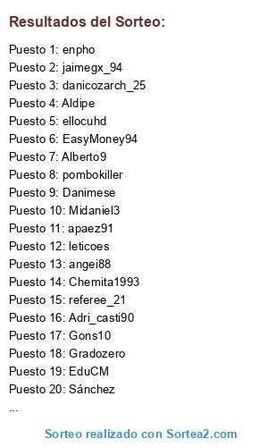 Lista de participantes: Aldipe, Adri_casti90, Josedvd89, ai-man-lol, enpho, Joryserso, pablo1093, Midaniel3, Danimese, Quiron888, Gons10, francisb04, fornides, apaez91, wazo, referee_21, pedroeloy95, danicozarch_25, mangel.sl, EduCM, Chemita1993, Orbi11, leticoes, JJDS8892, angei88, sito46, davidg981, alexmar_93, ellocuhd, JonanPB8, Uve_mula, sanmiguel25, Franciskiyo, EasyMoney94, Lokikolirota, pombokiller, jaimegx_94, Gradozero, Sánchez, Alberto9.